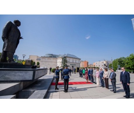 RTK2, Kim, 24.05.2022. - Predsednica Kosova Vjosa Osmani je povodom “Dana predsednika” odala je počast prvom predsedniku Kosova Ibrahimu Rugovi ispred njegove statue koja se nalazi na šetalištu u centru grada.